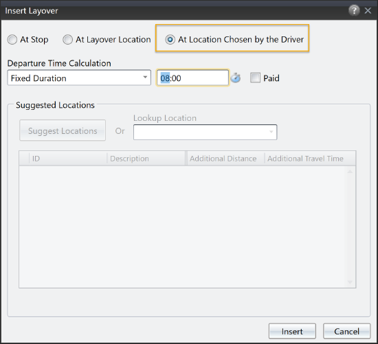 - Click At Location Chosen By Driver. Choose the Departure Time Calculation and, if necessary, enter the appropriate time. Check Paid if the driver is paid for the layover.
