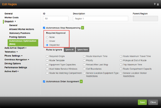 - In Autonomous Optimization, you can now require that stop resequencing and order assignment suggestions are approved.
